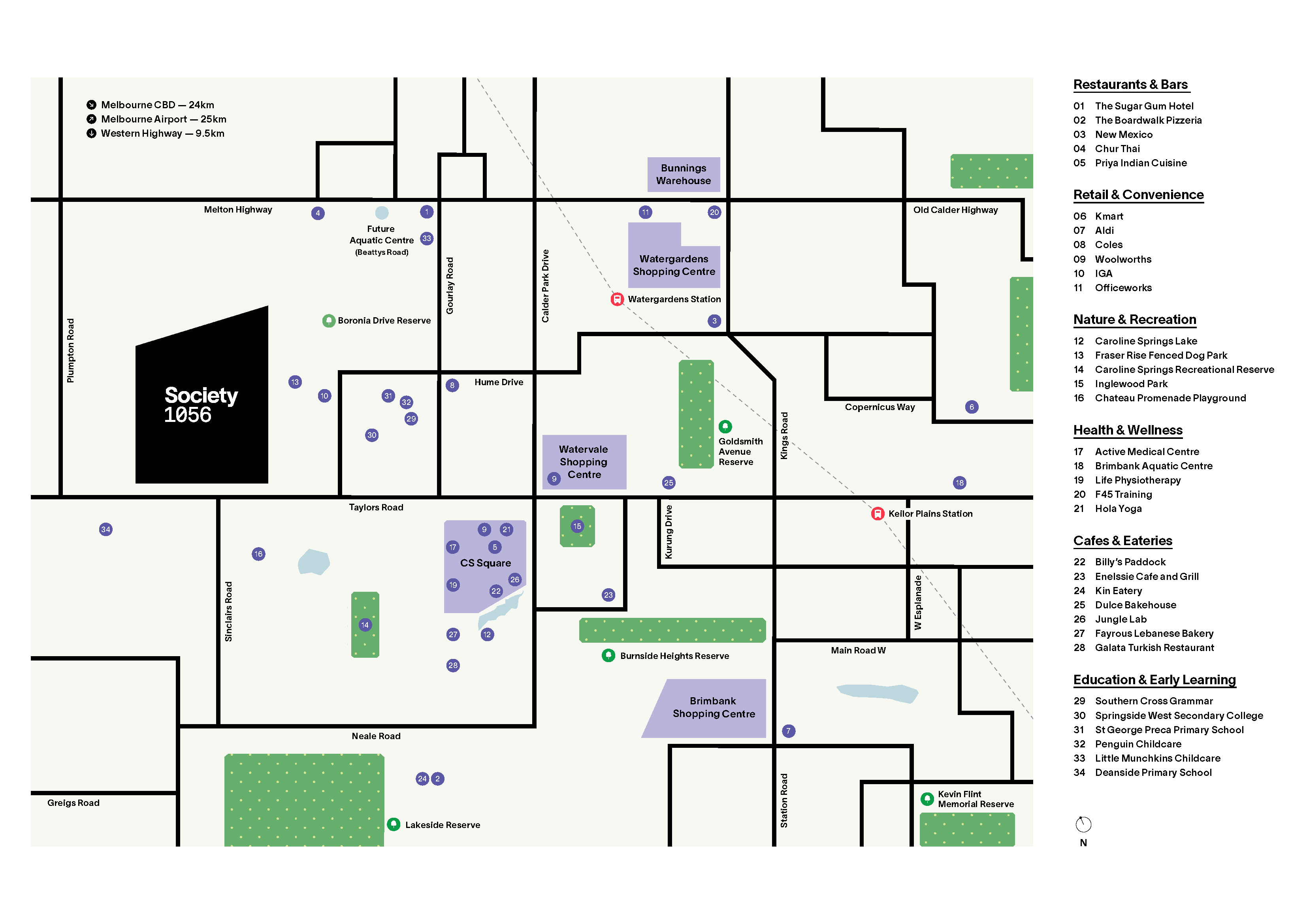 - Society 1056 features a local primary school, childcare, parks, playgrounds, shops and sporting ovals.