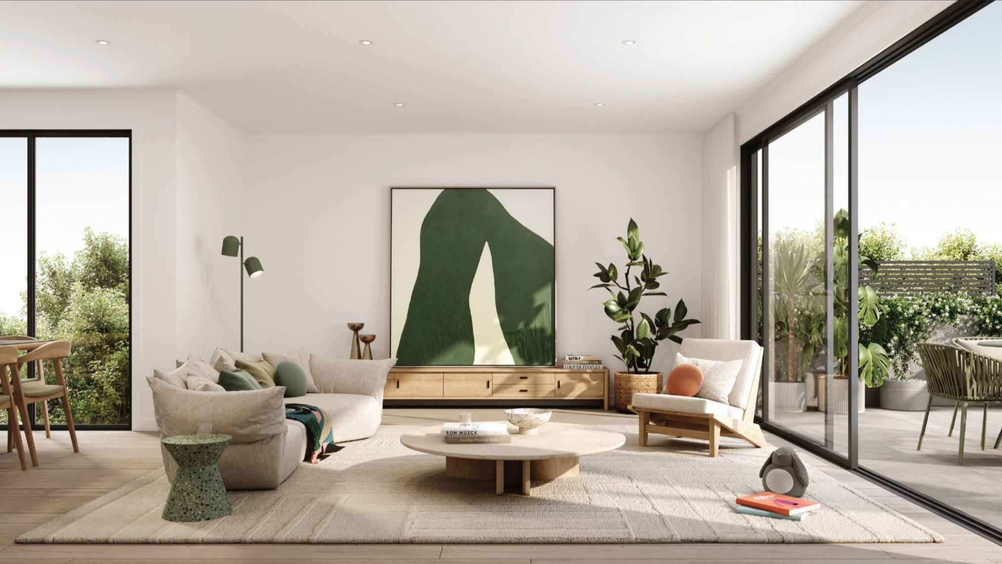 This honouring of community is further heightened with its interior design, with the sun-drenched landscapes and muted tones of Australian Impressionism (Australia’s first internationally acclaimed art movement, founded locally in Ivanhoe) the main inspiration. The faraway horizons and use of light within the impressionist’s artworks, is infused throughout the interior design; with the interplay of texture, tones and light combining to form a serene home environment.