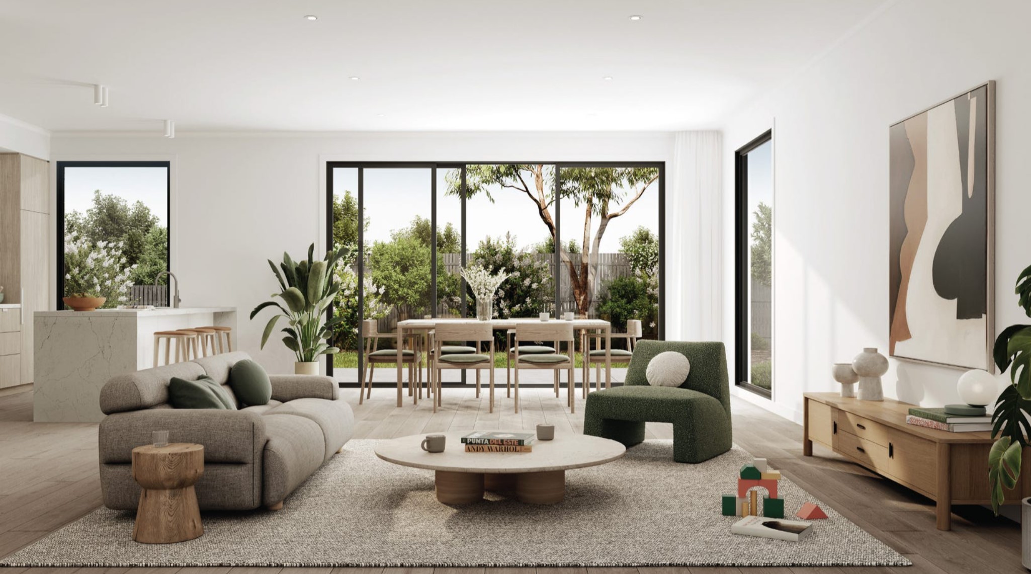This honouring of community is further heightened with its interior design, with the sun-drenched landscapes and muted tones of Australian Impressionism (Australia’s first internationally acclaimed art movement, founded locally in Ivanhoe) the main inspiration. The faraway horizons and use of light within the impressionist’s artworks, is infused throughout the interior design; with the interplay of texture, tones and light combining to form a serene home environment.