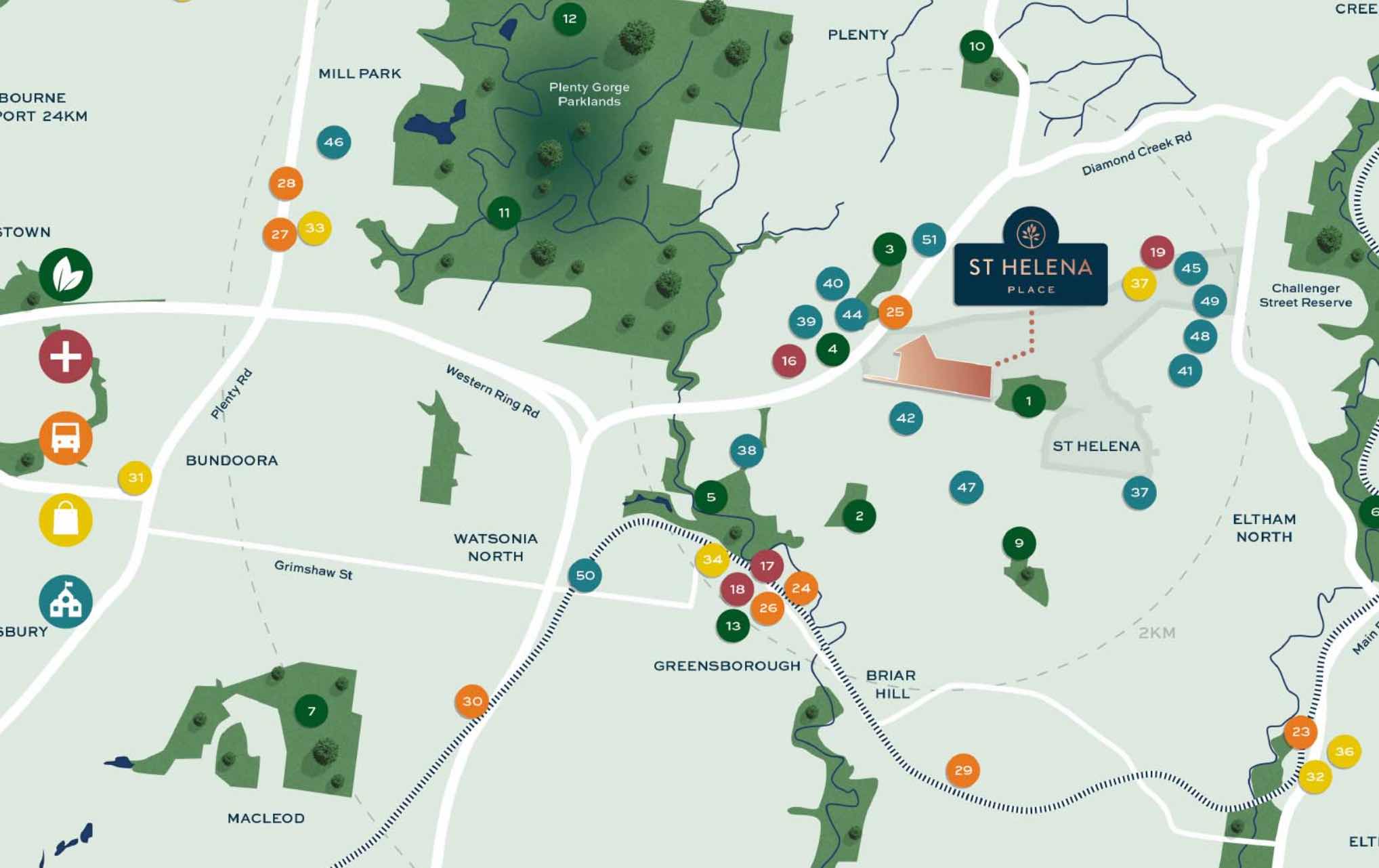- At St Helena Place, you'll always live within easy reach of enriching nature and everyday essentials. Embrace an active lifestyle with easy access to Diamond Valley Sports Centre and WaterMarc, and delight in the diverse shopping and dining experiences at St Helena Marketplace, Greensborough Plaza and Eltham Village.