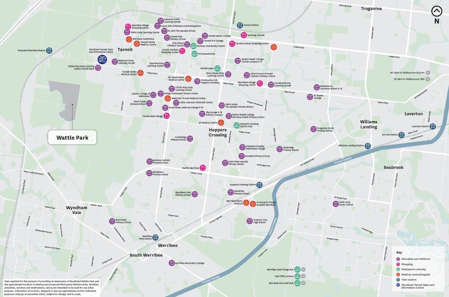 The updated Newhaven Masterplan has expanded to include an additional 53 hectares along Leakes Road. It encompasses four parks and playgrounds, with two already open, Wimba Primary School, future wetlands and waterway, proposed 10-hectare sports grounds, a town centre, and the proposed Tarneit West Train Station (planned to open in 2026).
