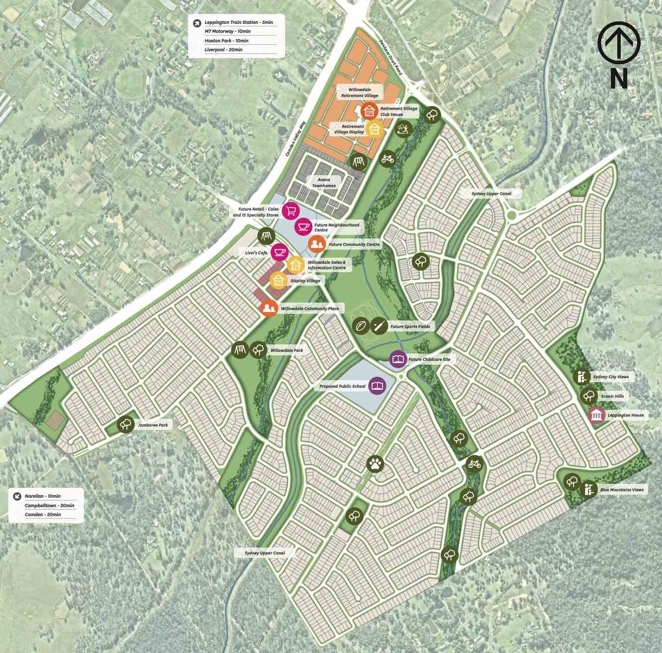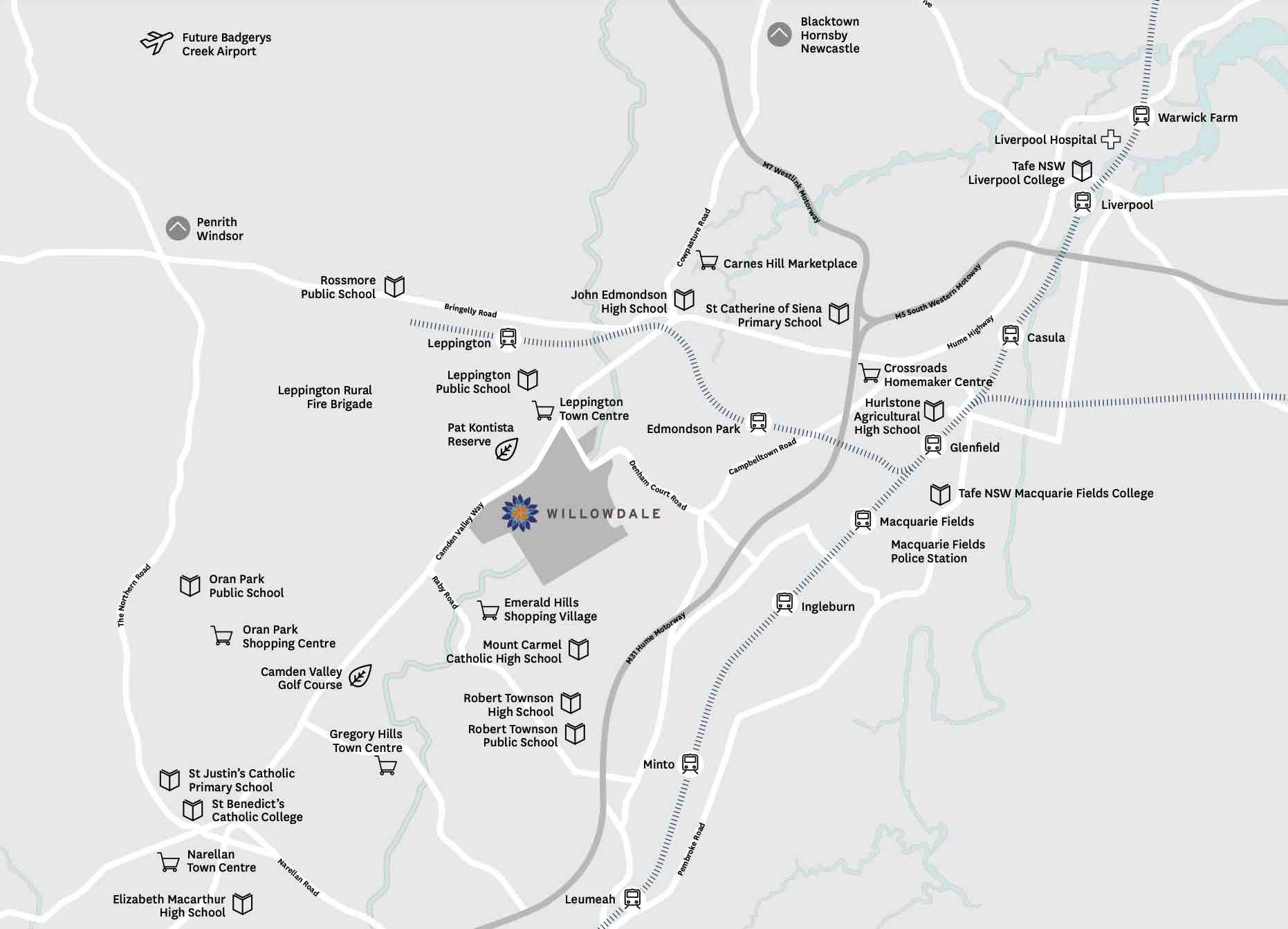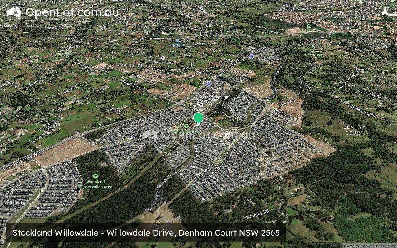 - Willowdale is a master planned community located in Sydney’s south-western suburbs approximately 50km away from the Sydney CBD. This new community incorporates over 3,500 residential lots including land lots, medium density town houses, a retirement living village, a primary school, a retail centre and extensive open space. The precinct is within excellent proximity to Leppington Train Station and connected closely to the M5 and M7 Motorway. With a future sports field, a future park, a future swim school and childcare center, this is the perfect opportunity for you to become part of a vibrant community.