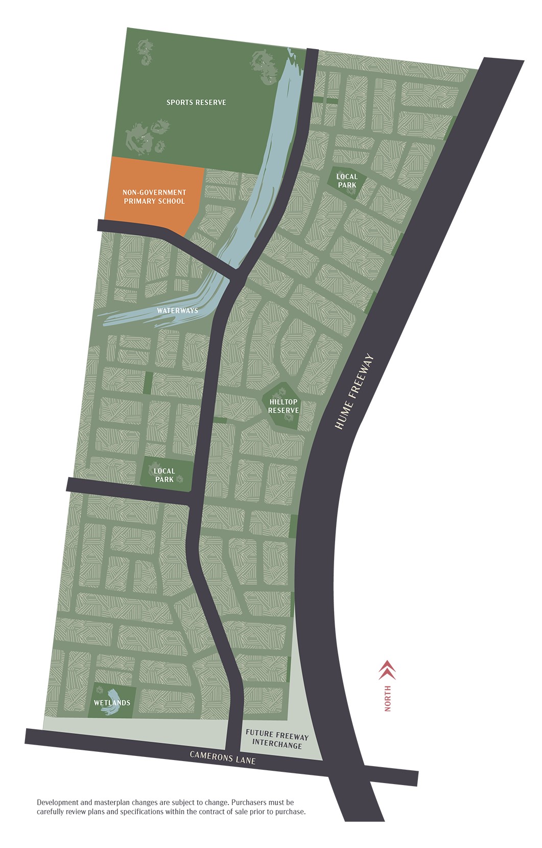 The suburb will include a network of shared paths, linking the local parks and a new road network. Land acquisition is provided to Camerons Lane and Rankin Street to facilitate intersection upgrades to the Hume Highway, providing a direct connection to Melbourne CBD or northern Victoria.