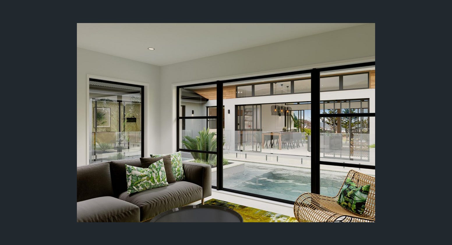 Three separate living zones wrap around a central courtyard allowing natural light and cooling cross breezes throughout the home. The gourmet kitchen including butler’s pantry, dining and family room flow out to a covered Alfresco area making entertaining a breeze.