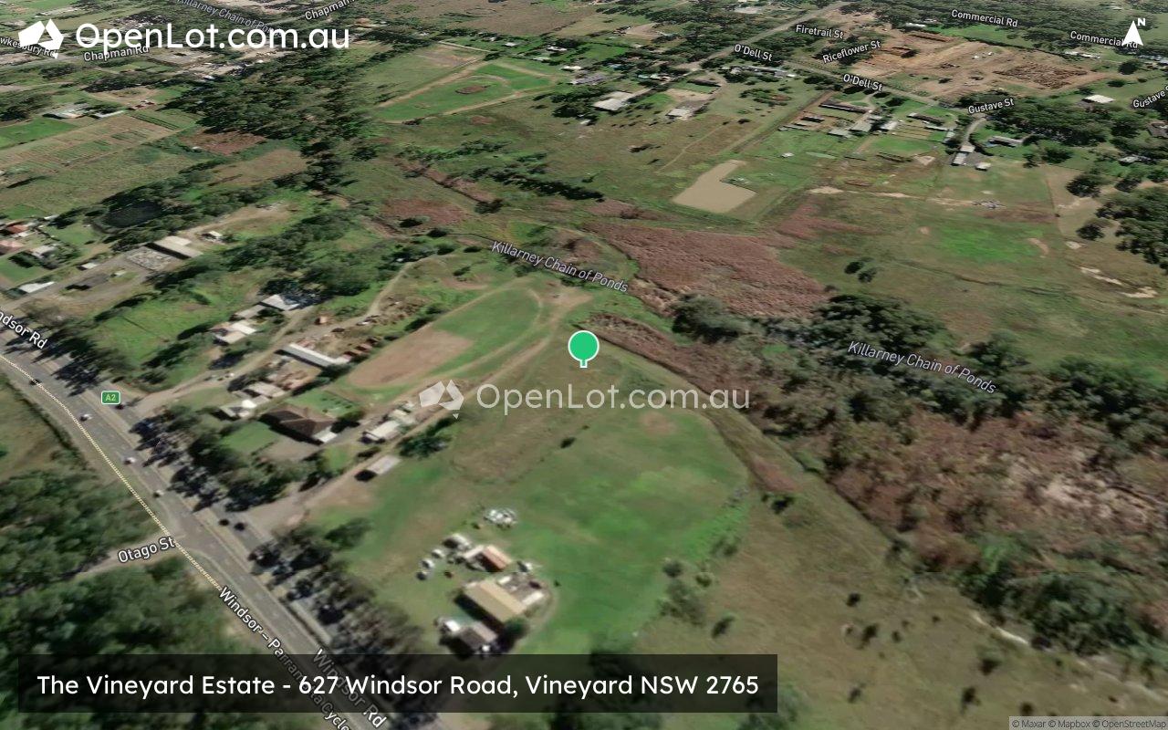 The suburb boundary is located along South Creek to the west and Eastern Creek to the east. The suburb boundaries to the north and south are along existing property boundaries. Windsor Road runs through the top of the suburb, parallel to the Blacktown Richmond Railway line that segregates the suburb. Eastern Creek runs through in the middle of Vineyard and Killarney Chain of Ponds to the north. Windsor Road provides access to the surrounding suburbs and local government areas, with a local network of roads providing access to the rural area.