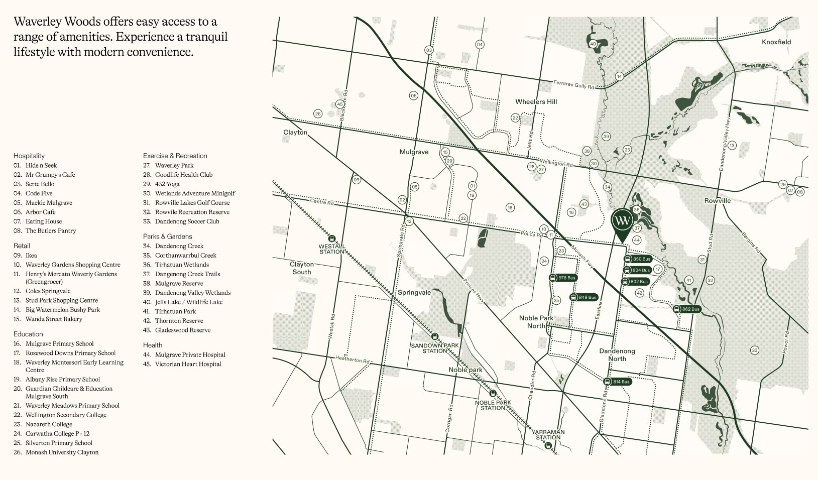 - Waverley Woods offers a peaceful lifestyle while being conveniently located near shops, restaurants, and entertainment options