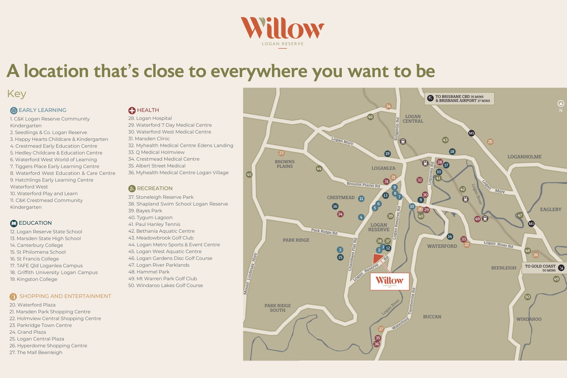 - A location that's close to everywhere you want to be, Willow is just 35 minutes from Brisbane, and 50 minutes to the Gold Coast.